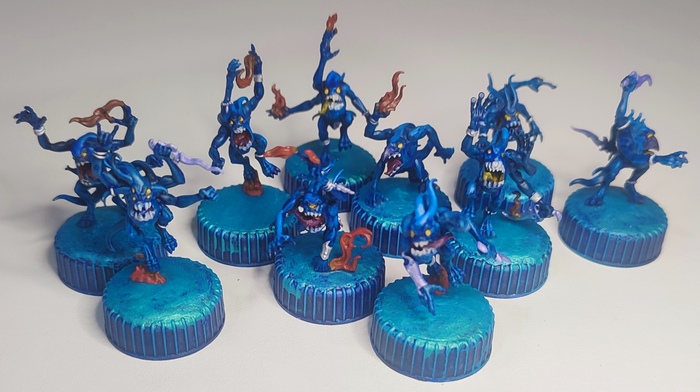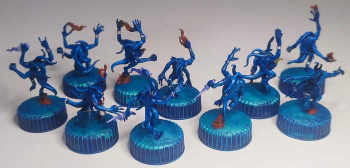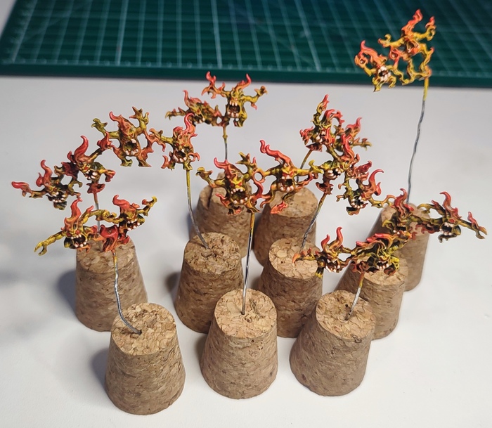 Красить несложно, но сложно покрасить их хорошо, потому что это 10 моделей, состоящих из мелких деталей типа зубов, пальцев и глаз. Ну и желательно изображать огонь от светлого к тёмному, то есть грунтовать белым грунтом, коего у меня нет. Поэтому огонёчки тускловаты.