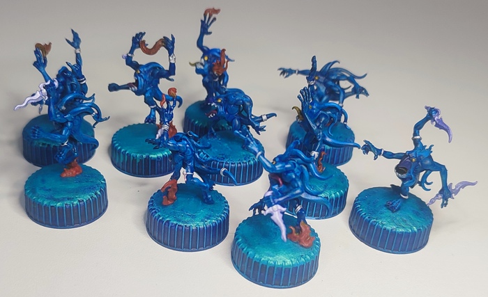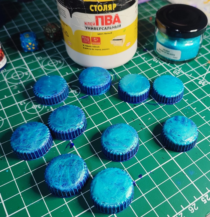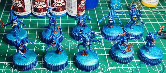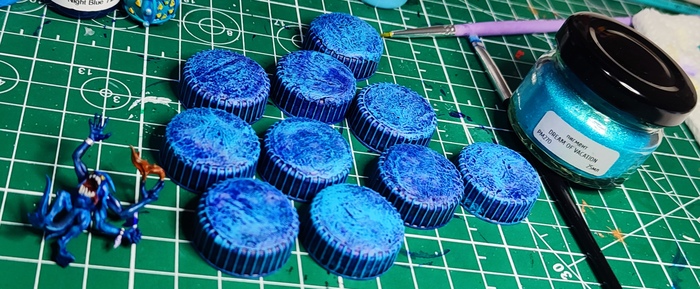 Ужасы - это буквально ожившие кошмары, они вопят, кидаются огнями и лопаются во взрыве магического пламени. Поэтому подставки им хотелось делать какие-то эдакие, волшебные. В этом очень помог перламутровый синий пигмент для эпоксидки - натыкав его пополам с синей полупрозрачной краской, молочные крышки (с бляшками модельной глины) превратились в эдакие кусочки волшебных облачков, откуда ужасы и повылезали.