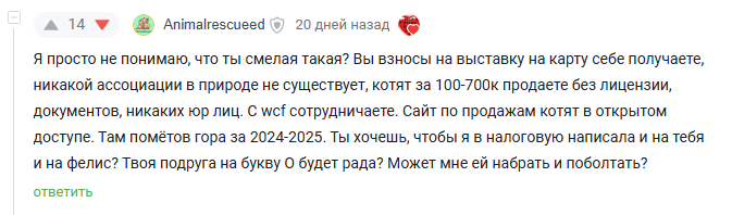 Какие именно неприятности могут ожидать наш клуб, я уже в курсе, поскольку наблюдала весь процесс на примере другого клуба. Может быть, это был и не самый лучший клуб, но ни он, ни его руководство, ни тем более рядовые заводчики и их животные совершенно не заслужили той безобразной травли, которую им устроила в соцсетях "команда волонтеров". Ну и плюсом, специально для нас, конечно, будет вот это: