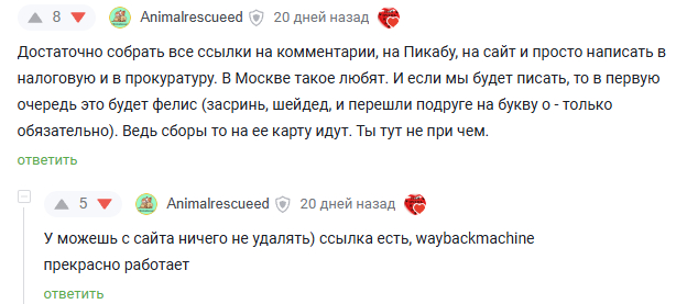 Специально для звонившей и угрожавшей: расследование не прекращу, хоть обпишись во все инстанции. Это будет даже очень кстати, поскольку если уж назначать какие-то проверки, то пусть проверяют всех - и в первую очередь "домашний приют", условия содержания в нем животных, санитарное состояние дома и участка, донаты, поступающие на личную карту. Несколько статей, посвященных этим темам, уже опубликованы на Дзене - но итог всего этого, пожалуй, будет достоин того, чтобы появиться и на Пикабу.