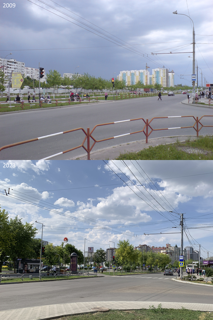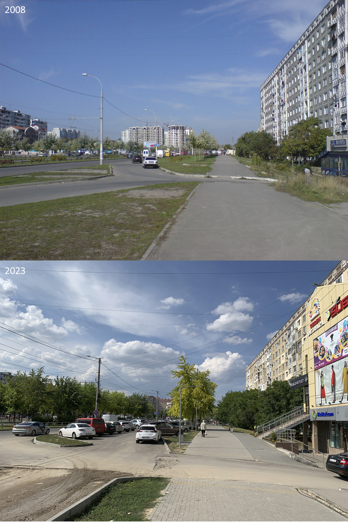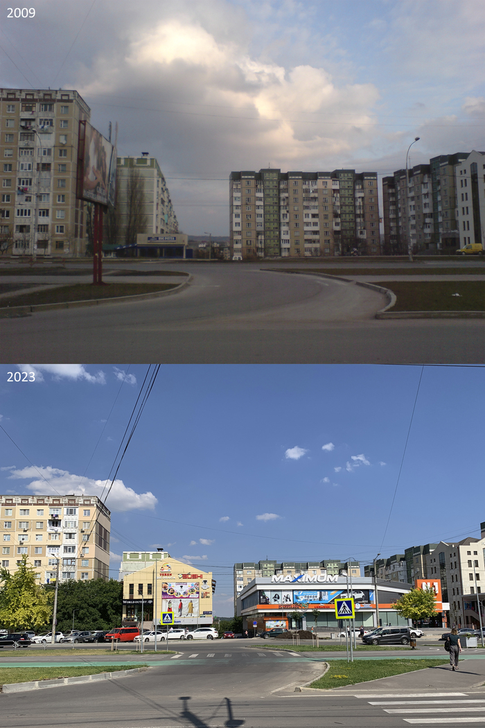 5. Здесь ракурс на место съёмки предыдущего коллажа (надеюсь понятно выразился) Появился супермаркет (справа), исчез билборд. Вместо маленькой пиццерии (слева) вырос мини-ТЦ с магазом одежды, парикмахерской, аптекой, закусочной и прочее.