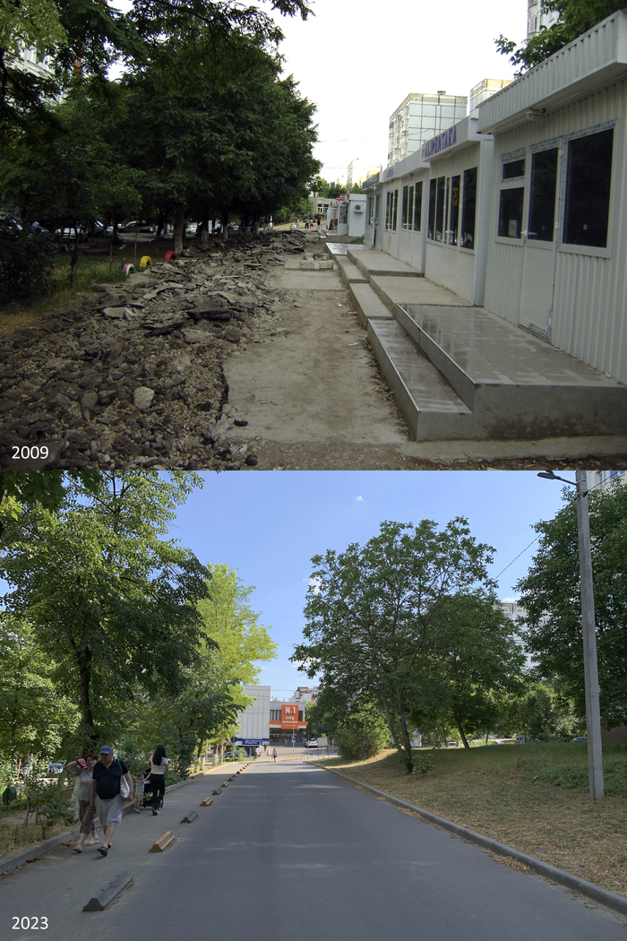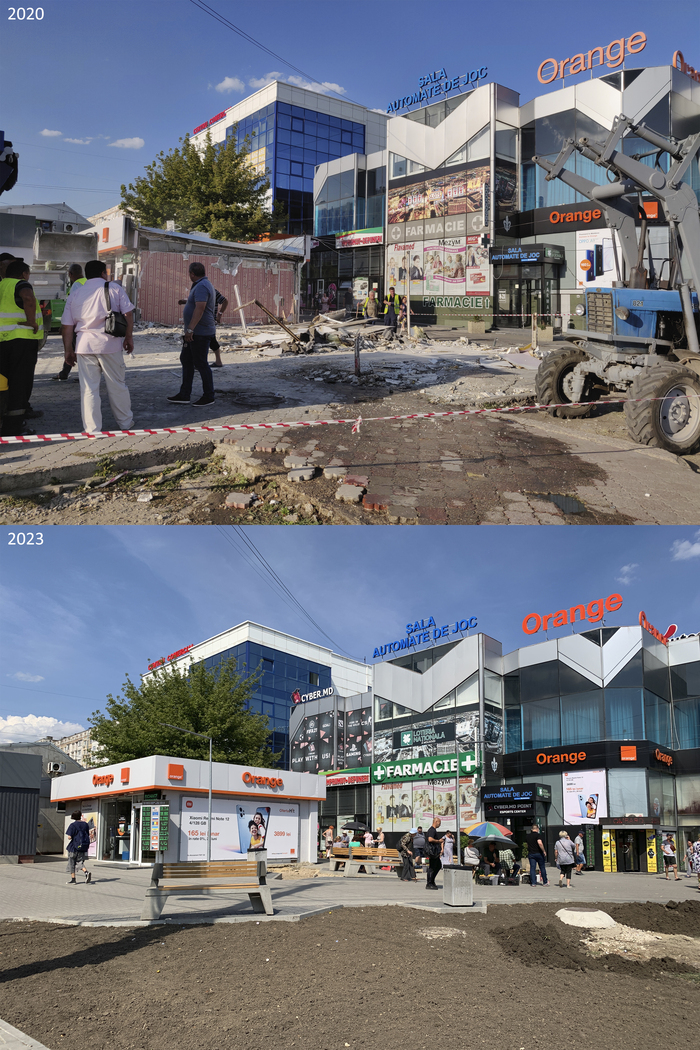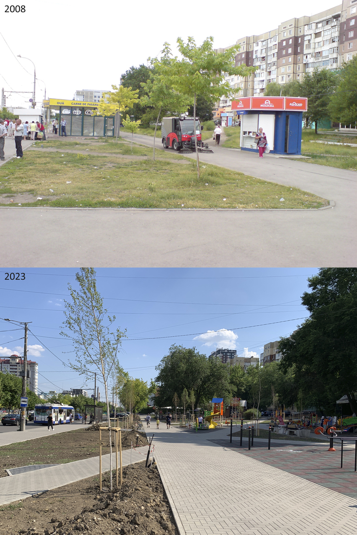 3. Пересечение улиц И.Виеру и Мирча чел Бэтрын. Сразу бросается в глаза безвкусный красно-белвй забор, который на следующей фотографии уже серый (а ближняя часть вообще исчезла) Ну и темпы застройки конечно впечатляют, из-за деревьев не особо заметно, но за желто-голубыми новостройками появился почти что новый микрорайон. Слева - вместо уличных торговцев - киоск с кофе и мороженым.
