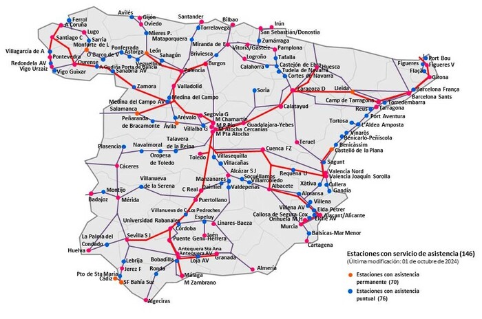 Все поезда идут через Мадрид, в Мадриде удобная технически (но боже, как же хуево там с указателями!) пересадка с вокзала на вокзал и с поезда на поезд.