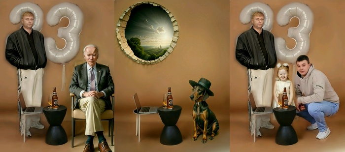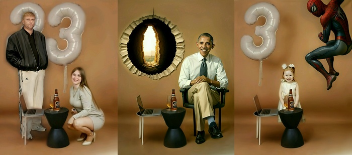 Там мастера попросили убрать мужа из семейной фотографии дня рождения дочери. Он же сделал два варианта: на одном мама с дочкой вместе; на другом один отец с пивом. Я дополнил эту серию наименее возможными вариантами.