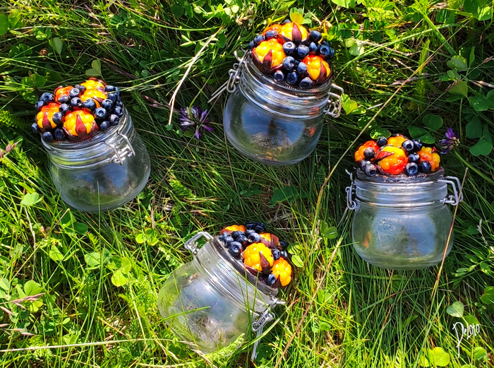 Баночки для специй с декором из полимерной глины в виде ягод. Морошка и черника.
