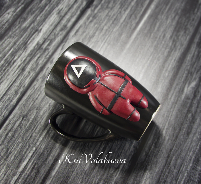 Работала с запекаемой полимерной глиной. Декор посажен на эпоксидный клей. Очень интересная получилась кружечка. Для настоящего фаната сериала ☺️