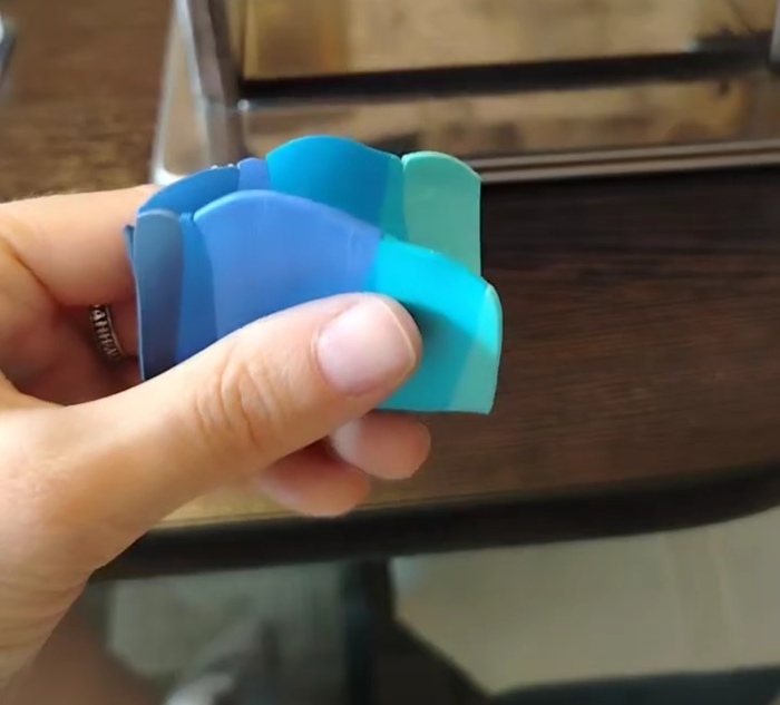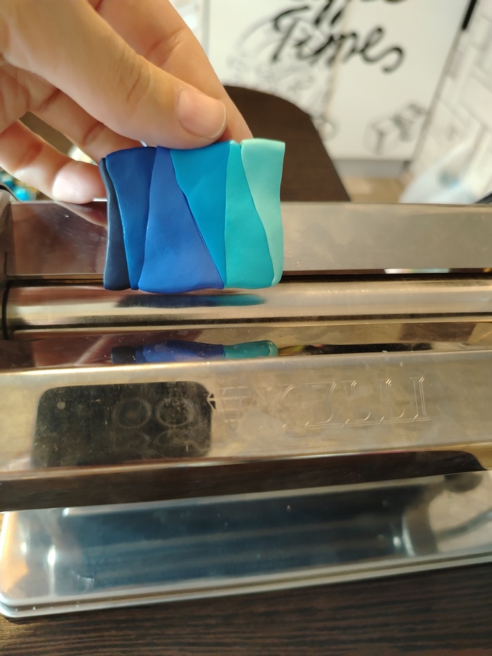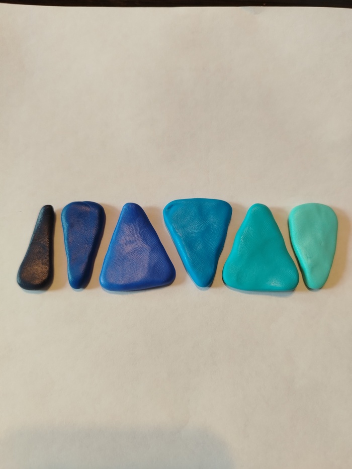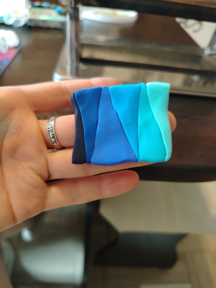Нам понадобится глина несколько оттенков синего и бирюзового. Формируем такие треугольнички, укладываем от более темного к светлому: