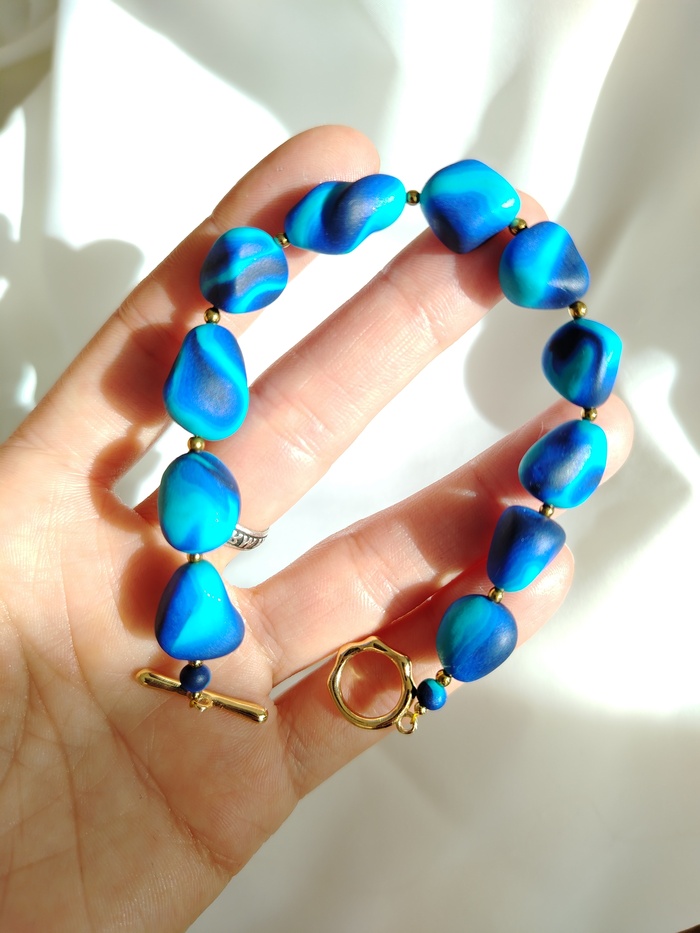 В этом посте я расскажу, как сделать из полимерной глины синие бусины с переходом цвета. В конце поста будет фото браслета из таких бусин.