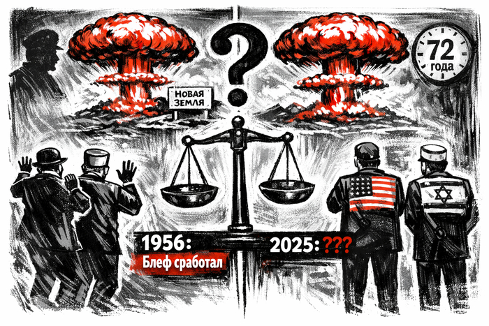 Каждый элемент на месте. План уничтожения. Ядерный блеф. Союзник под ударом. Геронтократия без прогностики. Даже география повторяется: Новая Земля, Ближний Восток.