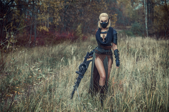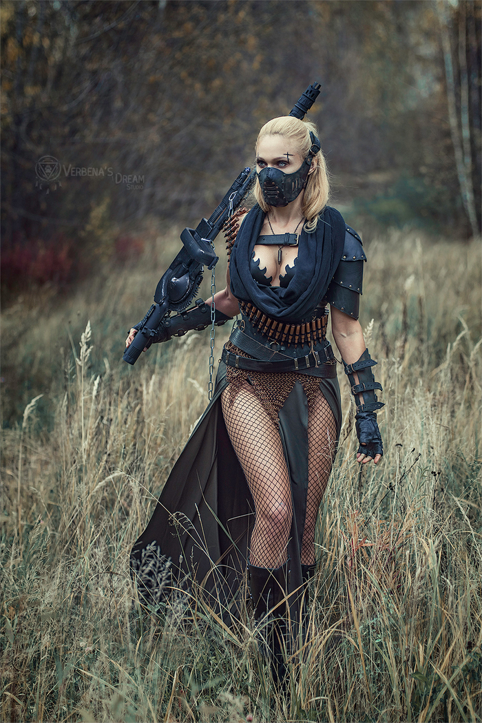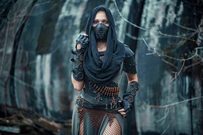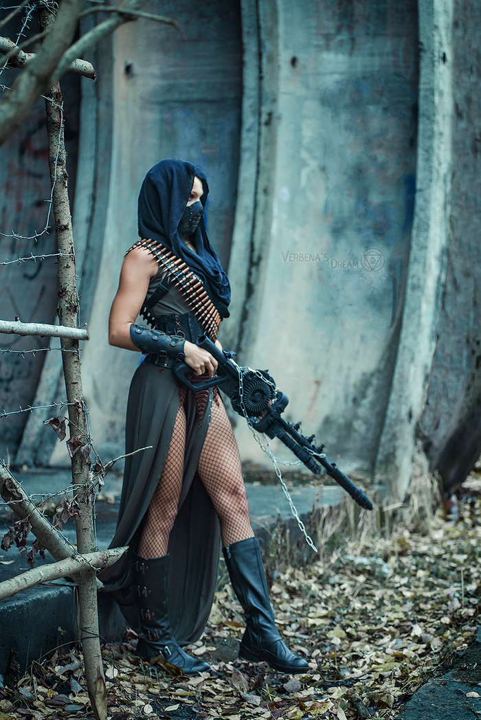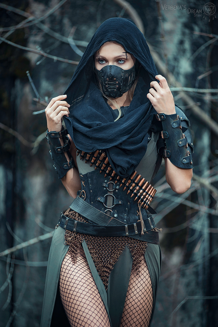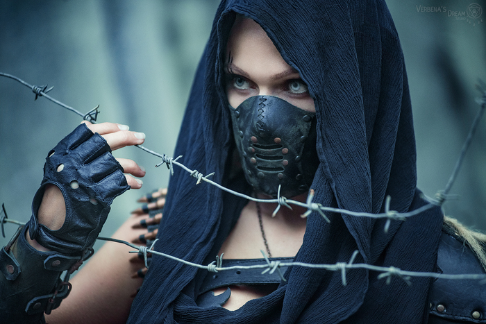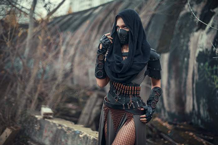 Армейский бушлат сверху, чуть нараспашку. Перетянут ремнём, на котором висит нож. Лёгкая чёрная шапка на голове. В руках самодельное копьё из металлического карниза. Наконечник — пара ножей. Один вставлен внутрь железной трубки и держится очень прочно. Второй примотан скотчем сбоку. И ничего страшного, если он останется в гнилой плоти, куда его воткнут. Ноги защищены накладками из толстых журналов. На руках строительные перчатки.