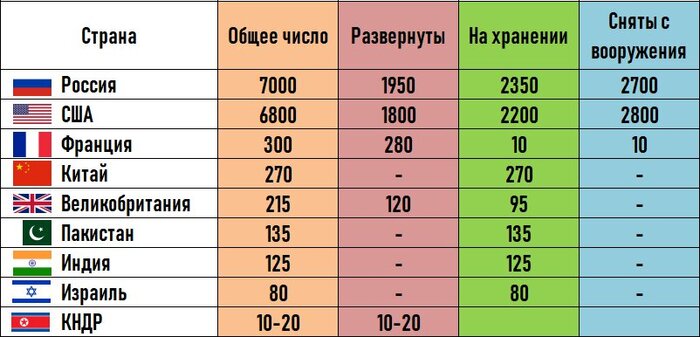 В целом, специалисты насчитывают в мире приблизительно 12 500 единиц ядерного оружия. 89% приходится на США и Россию. Согласно оценкам Arms Control Association за 2023 год, 5889 – у России, 5244 – у США. Это число включает ракеты всей "ядерной триады" (шахты на суше, стратегические бомбардировщики, атомные подлодки).