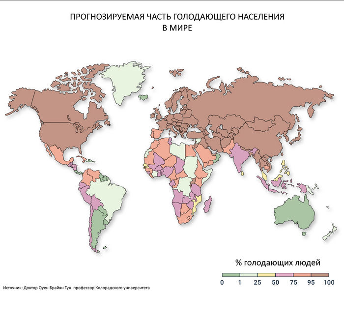 "Проведенные оценки показывают, что количество смертей из-за отсутствия продовольственной безопасности составляет 2 млрд для сценария индийско-пакистанского конфликта (масштабной ядерной войны) и 5 млрд в полномасштабном сценарии", – говорит ученый