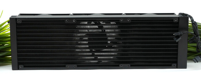 В качестве пассивного охладителя PCCooler DA360 Pro ARGB выступает стандартный радиатор 397 х 27 мм с толщиной рабочего тела 17 мм. Число ребер на дюйм (FPI) составляет 20-21. Радиатор качественно покрашен.