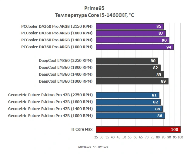 Эффективность системы жидкостного охлаждения PCCooler DA360 Pro ARGB соответствует своему уровню и мною оценивается в 270W. По общим результатам она практически близка модели Ocypus Delta L36 ARGB v2, которую у меня было немного времени протестировать. Да и в ценовом сегменте они очень близки.