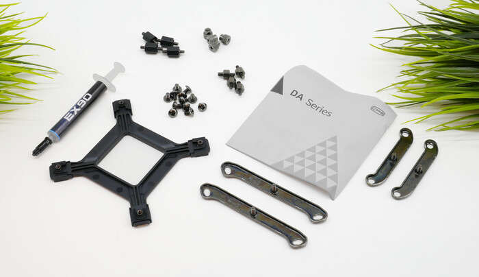 Комплектация системы охлаждения включает необходимые винты крепления, стойки, рамки, бэкплейт и шприц с термопастой EX90 (теплопроводность 14.8 (W/m°C)). В качестве инструкции — небольшой буклет. Всё простенько упаковано в одноразовые пакеты и спрятано в отдельной коробке.
