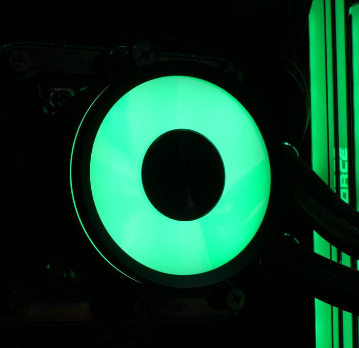 Подсветка помпы реализована по периметру и в центральной части корпуса. Камера не передает сочность картинки, но свечение у PCCooler DA360 Pro ARGB достаточно красивое и приятное.