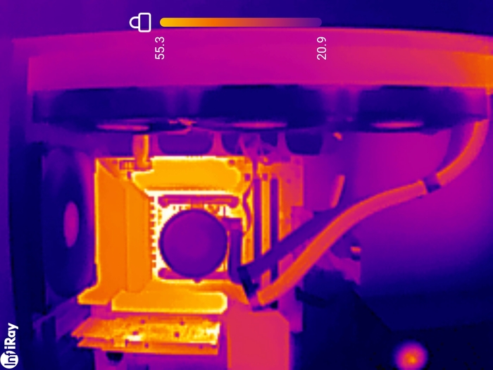 Одна из сильных сторон PCCooler DA360 Pro ARGB точно заключена в акустическом комфорте! Керамическая помпа даже при 3300 об/мин остается очень тихой, даже бесшумной, в то время как некоторые другие решения, например, некоторые модели DeepCool, издают электрический треск. Также у данной СЖО достаточно комфортные вентиляторы в плане шума! Я бы назвал их бесшумными до 1300 об/мин, тихими — до 1600 об/мин и комфортными до 1950 об/мин.