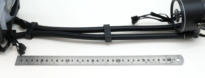 У системы жидкостного охлаждения PCCooler DA360 Pro ARGB длина трубок в нейлоновой оплетке составляет почти 400 мм. Они очень тугие, установлены два фиксатора. Диаметр трубок равен 12,2 мм.