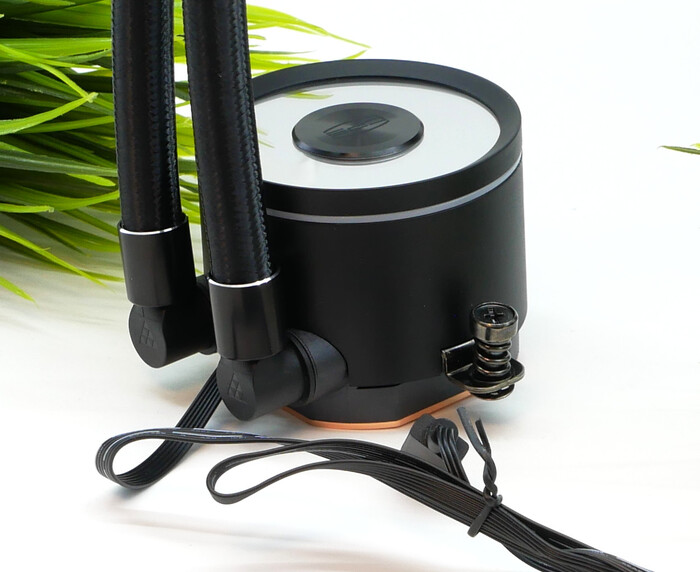Информации о строении и конструкции помпы-водоблока мало. Но производитель подчеркивает, что внутри используется керамический подшипник, что очень важно: это повышает ресурс устройства и значительно снижает уровень шума. Скорость работы фиксирована и составляет ~3000 об/мин. От помпы отходят два провода: питание 3-pin и 3-pin 5V ARGB. Еще у модели поворотные, но очень тугие фитинги.