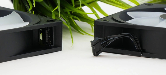 Что касается подключения, то они коннектятся последовательно. Производитель использовал популярную китайскую схему с вилкой 7-pin. Замену вентиляторам будет найти непросто. Далее подключается привычный удлинитель-разветвитель на 4-pin PWM и 3-pin 5V ARGB.