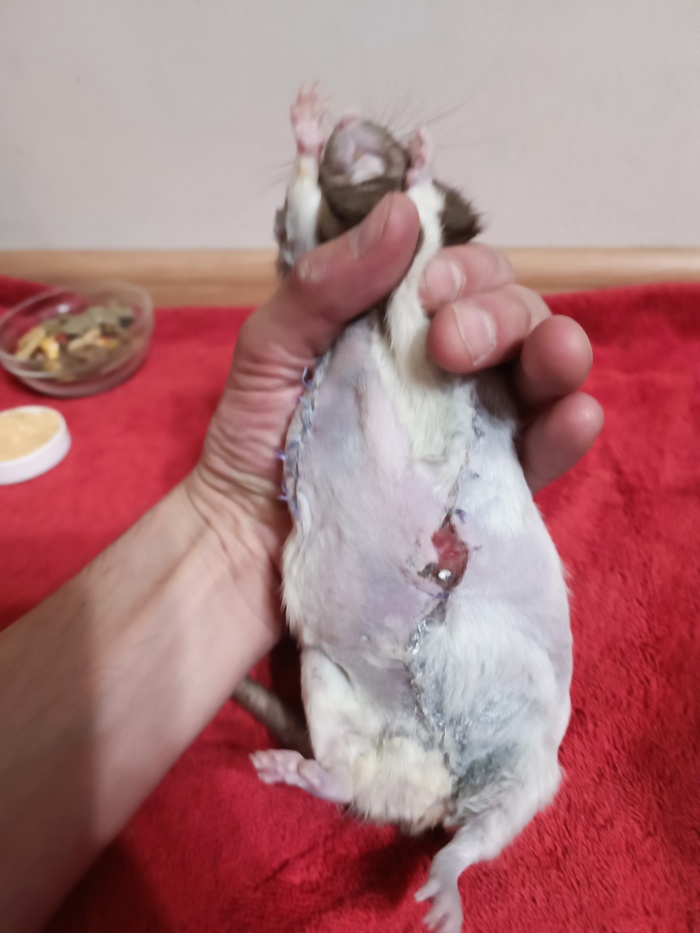 Спасибо всем не равнодушным за критику, советы и поддержку. После размещения моего первого поста о питомце, я осознал что мое бездействие ни к чему хорошему не приведет. Мне стоило углубиться в детали проблемы и сразу получить консультацию у ратолога из другой клиники, а я получив информацию от ветеринара и прочитав первые попавшиеся отзывы в интернете решил что помочь могу только уходом за зверьком. Кароче... Как только мне накидали дерьма в понамку я сразу кинулся искать врача и нашел. Сходили на прием и через два дня приехали и удалили 3 опухоли, матку (собственно она корень проблем с опухолями), а также почистили нагноения в матке. За два месяца у лолы примерно на 90 процентов затянулись швы, не испытывает дискомфорта, кайфует.