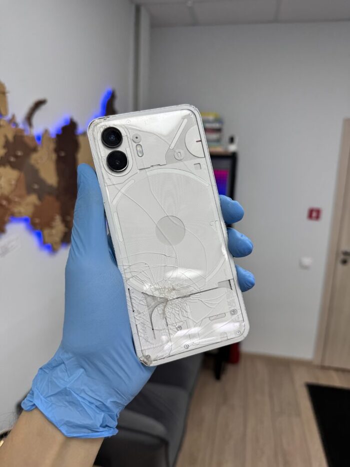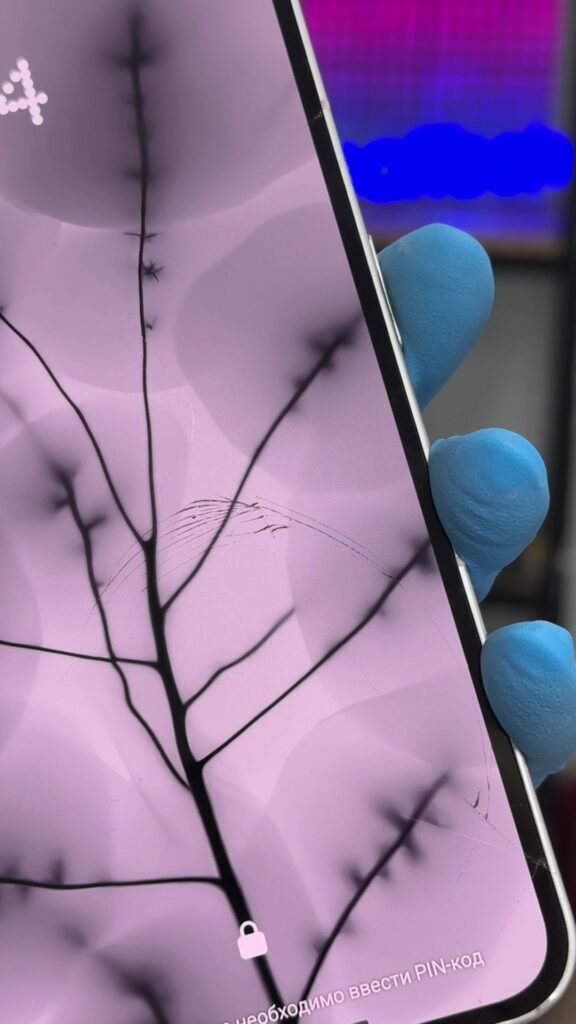 Но удар в корпус или на угол разбивает стекло вдребезги с огромным количеством внутренних осколков, которые легко могут разорвать матрицу при переклейке.
