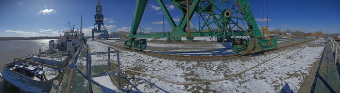 Вид на портовый причал с запада на восток. Слева, за фронтальным погрузчиком и самосвалом, здание портовой администрации.