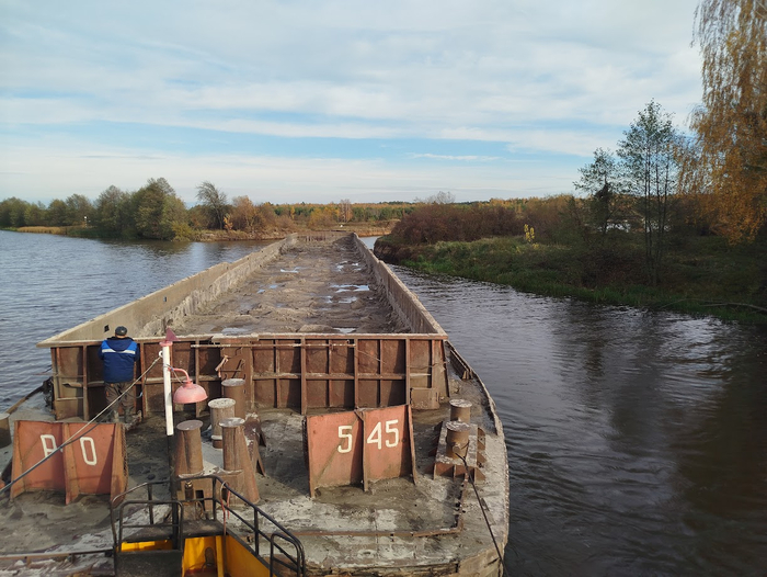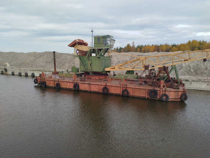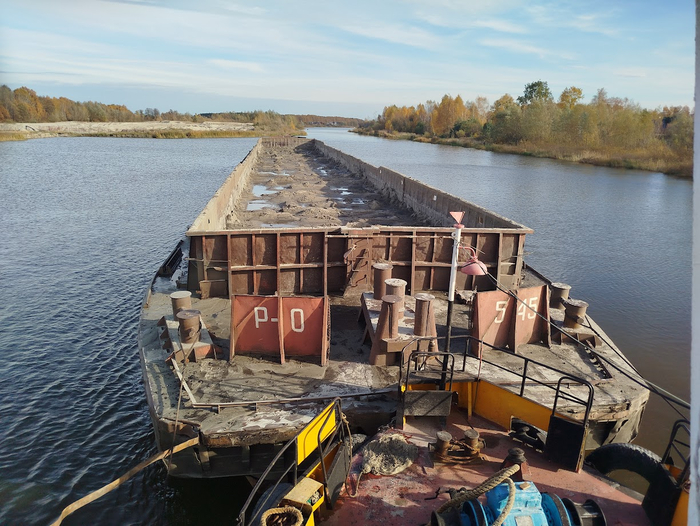 Баржа, грузоподъемностью до 1100 тонн. Почти готова для транспортировки к земснаряду. Будучи порожней, имеет осадку около 40 сантиметров. Длина рудовоза 75 метров. Немало.