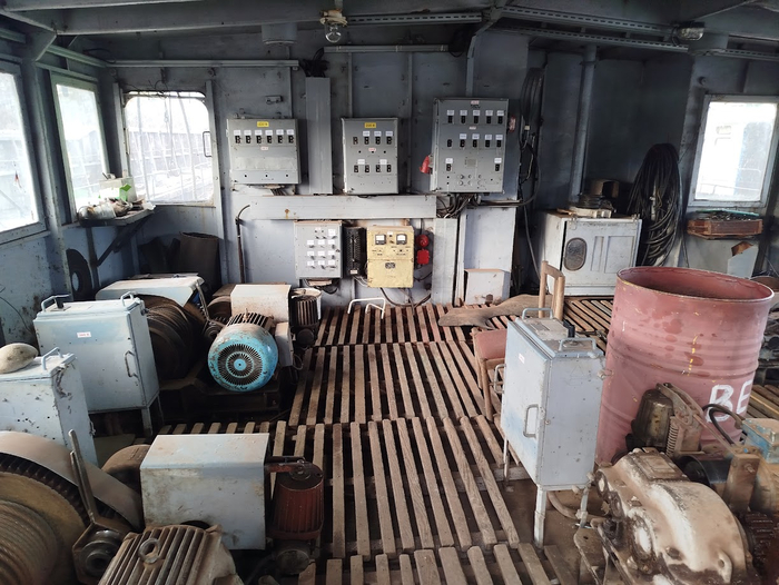 Вот мы непосредственно на самом земснаряде. На нем стоит дизель 3Д12, который приводит в движение насос, который сосет со дна (до 12 метров) воду и песок, глину. Все это добро выливается прямо на палубу рудовоза. Вода стекает через шпигаты, песок остается.