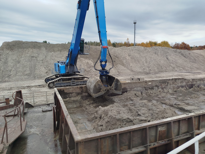 А вот это чудо перегружатель (кагбэ экскаватор, но нет). Кабина поднимается высоко, чтобы глядеть далеко. Перегружатель грябает по грузовой палубе рудовоза, выгребая речной песок и насыпая им горку слева от себя. Перегружатель стоит большие деньги. Больше мильона евры!