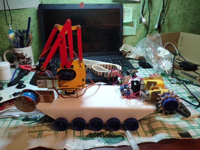 Сразу скажу что все подсмотрено из интернетов. Это мой первый опыт. Делал из того что было под руками. Хочу услышать в коментариях советы или ваше мнение по поводу проекта. Когда начался карантин я решил сделать какой нибудь интересный проект. Выбор пал на руку манипулятор. Решено было поставить руку на движущуюся платформу и управлять все с помощью пульта. Далее расскажу про само создание:
