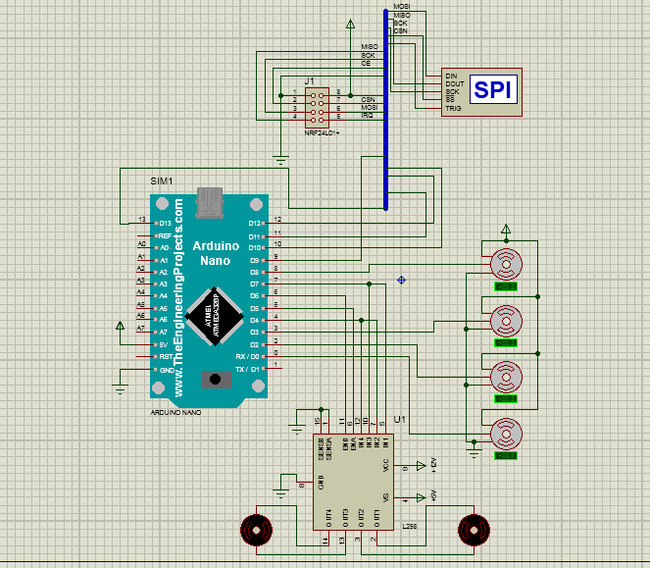 Платформу я вырезал также из пвх пластика. На нее поставил 2 мотор редуктора и драйвер который ими управляет (L298N), такой же радиомодуль NRF24L01 и ардуино уно ( в схеме нано но у меня в наличии лишней не было). В эту же схему подключается 4 серво из которых состоит рука манипулятор. Хотел сделать что то на подобии гусеничной платформы но не закончил. Схему набросал в протеусе.