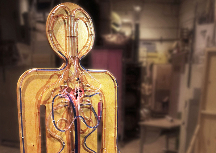 "Я использовал шланги, подкрашенную дистиллированную воду и два прозрачных насоса. Сделал силуэт человека и, соответственно, показал циркуляцию артериальной и венозной крови с помощью жидкости, — вспоминает изобретатель. — Там был сложный момент: выяснилось, что движение жидкости в прозрачном шланге увидеть невозможно. Поэтому я придумал сделать два отверстия в шлангах в правильных местах, чтобы движущаяся вода захватывала пузырьки воздуха и дальше бежала вместе с ними. Тогда-то я понял, что многие явления природы, науки, техники можно показывать с помощью разных объектов".