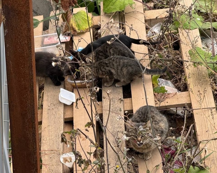 История эта началась на одной стройке. Там, среди плит и строительного мусора, выживало кошачье семейство: мама и четыре котенка. Рядом с ними постоянно крутился большой черный кот — видимо, папаша. Люди ходили их кормить, поддерживали чистоту, даже построили домик теплый (который вскоре ктто-то сломал), но ресурсы забрать всех разом нашлись не сразу.