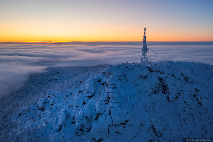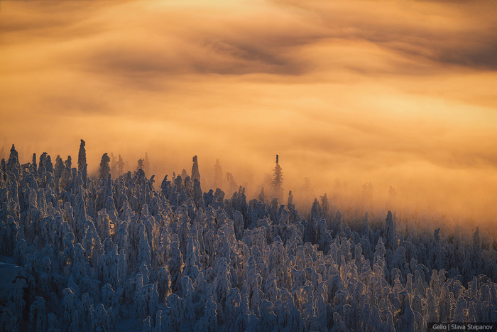 9. Зимний рассвет над Полюд — тайга скрыта под облачным морем, а вершина остаётся островом снега и камня.