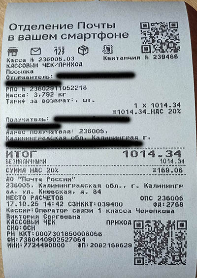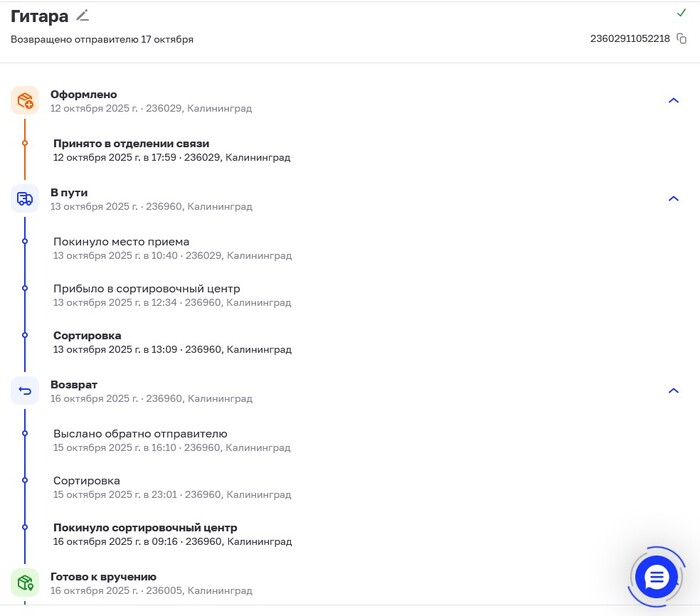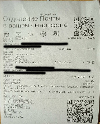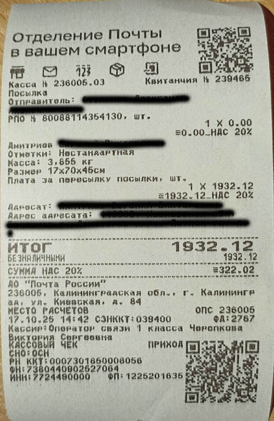 Дело было в октябре-ноябре 2025го. Нужно было отправить посылку – гитару под реставрацию. С начала 25го года цены на пересылку из нашего региона (Калининград) стали просто космические. Можно отослать либо Почтой РФ, либо СДЭК, но СДЭК раза в 2 дороже. Покупатель решил почтой, заранее оплатил пересылку и сам товар. Упаковал я посылку компактно: снял гриф, уложил рядом с декой. Отправка коробчонки менее 4-х кг и габаритами 17х70х45 см вышла около 1932р. Отправлял в отделении 236029.