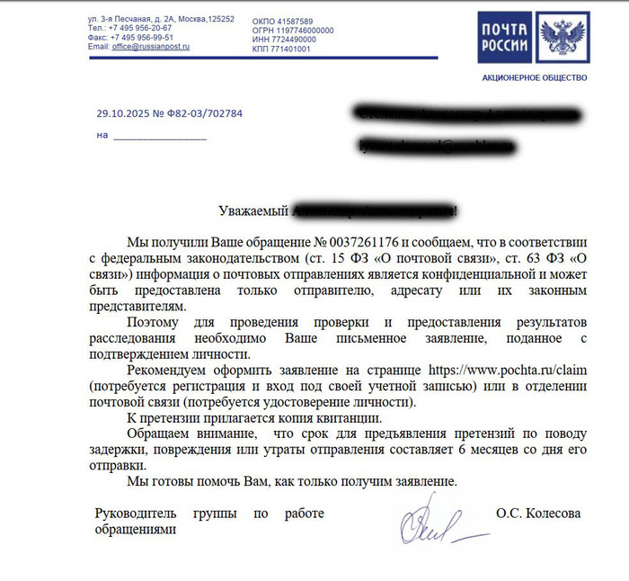 Ветка переписки с представителями Почту РФ в Контакте тут, если интересно:
