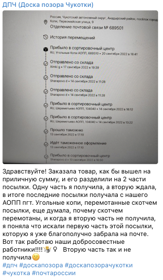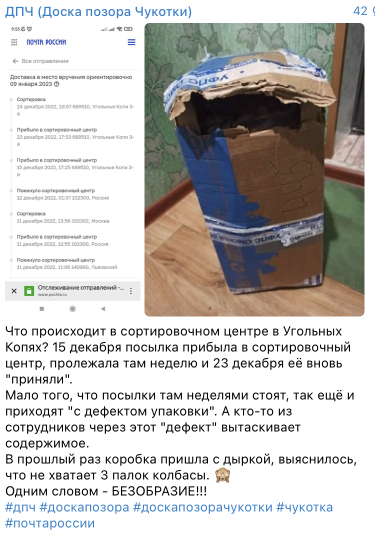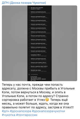 По трек-номерам видно, что большинство посылок застревает в сортировочном центре в поселке Угольные Копи. И, похоже, «Почта России» в курсе этой проблемы — в 2021 году на Чукотку приезжал генеральный директор Почты и по поручению полпреда Юрия Трутнева решили строить новый сортировочный центр.
