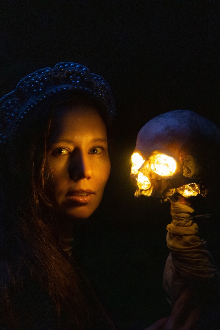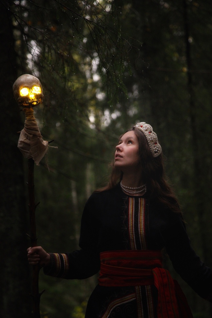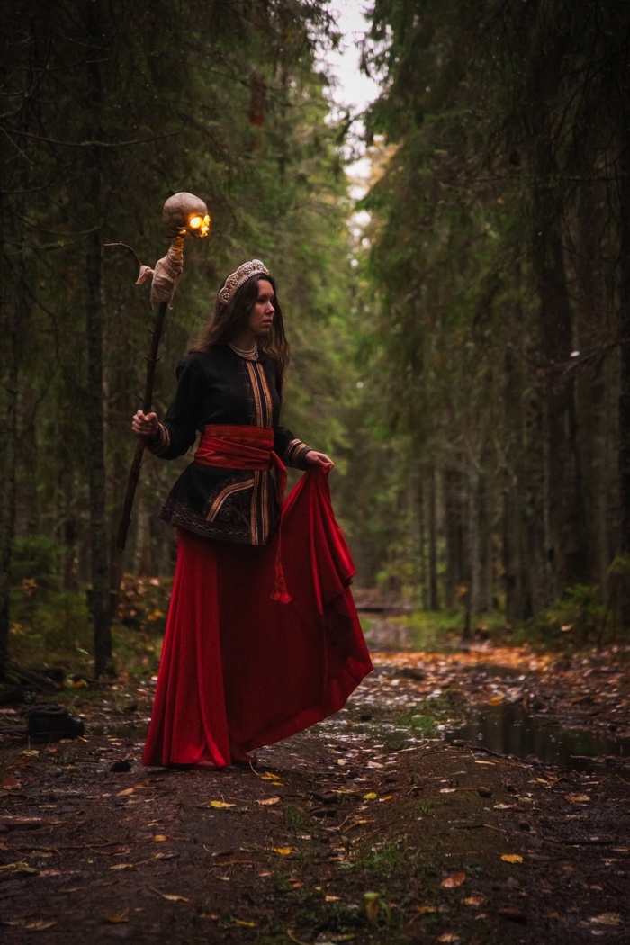 — На площади уже поставили бревно, разложили вокруг хворост, чтобы поджечь его. Люди успели наготовить угощения, личины приготовили. Волхвы жертвенного бычка подготовили. И готовились обряд начинать. Тут и князь с женой молодой подоспели, каки положено. Дадон горло быку перехватил, кровушкой окропил камни жертвенные. Чтобы урожай хорошим был, чтобы боги не гневались. И началось празднество. Княже и жена его Марья тоже личины надевали, у Дадона козья морда, почти как у Лешего, а у жены его личина мавки.