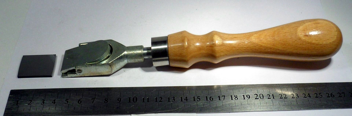 Устройство ручного шабера максимально простое. Это ручка со штоком на конце которого прикреплена твердосплавная пластина , которой и скоблят металл. Вот он кстати