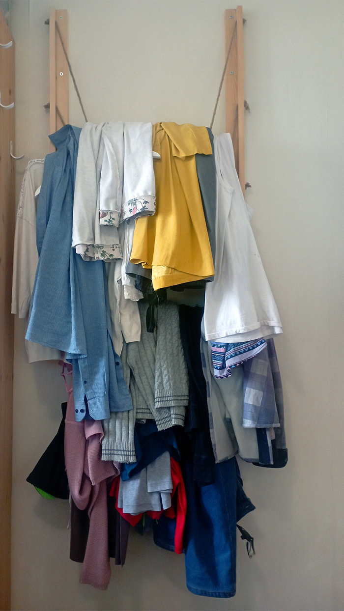 Большинство одежды между стирками используется несколько раз. Чистая вещь достается из шкафа, носится один раз, и снова становится грязной — но ещё достаточно чистой, чтобы её можно было надеть повторно. А место на стуле и тренажёре занимает всё больше и больше. Ну а кто любит сидеть в заваленной одеждой комнате? Поэтому решил что-то с этим делать.