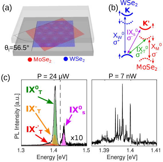 В гетероструктуре из 2H-MoSe2/WSe2, заключенной в hBN, наблюдается выравнивание электронных зон типа II и спин-долинная конфигурация, приводящая к появлению ярких экситонных состояний внутри слоев WSe2 и MoSe2, а также спин-синглетных и спин-триплетных межслойных экситонов, зарегистрированных в спектрах фотолюминесценции при различных мощностях возбуждения P=24mu W и P=7nW.