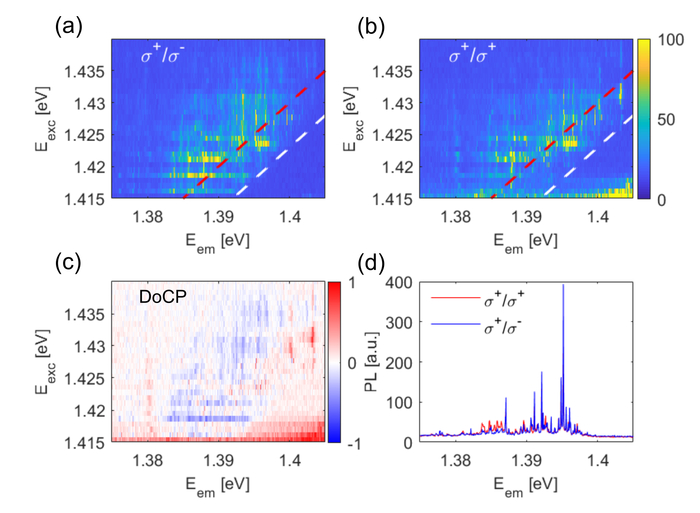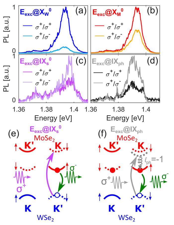 Исследование спектров фотолюминесценции межслойных экситонов выявило, что резонансное возбуждение, настроенное на внутрислойные экситоны WSe₂ и MoSe₂ или на сингулетные межслойные экситоны, приводит к эмиссии, подчиняющейся правилам оптического отбора для прямых электронных переходов, в то время как возбуждение, опосредованное хиральными фононами, вызывает циркулярно-поляризованную эмиссию, отражающую перенос псевдо-углового момента от фононов к экситонной системе.