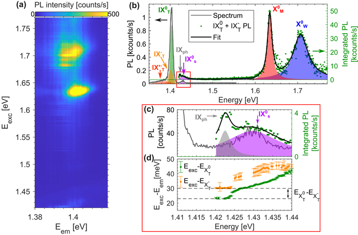 Анализ спектров фотолюминесценции возбужденного лазером образца показал зависимость интенсивности пиков IXT0⁰T и IXT⁻T от энергии возбуждения, которая была успешно аппроксимирована четырьмя лоренциальными пиками, что позволило определить энергии возбуждения для каждого пика.