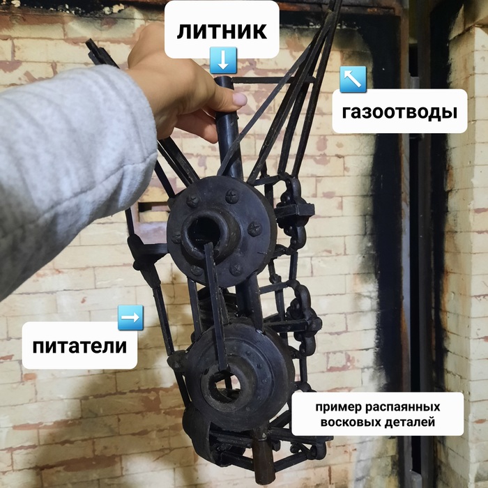 6⃣ Восковка распаивается – то есть берётся восковой литник и к нему от работы припаиваются восковые питатели, а так же восковые газоотводы.
