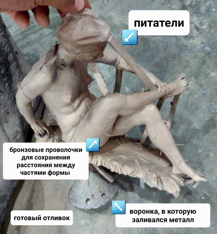 В итоге, когда бронза залита в опоку, после остывания, разбирается опока, раскалывается гипсопесчанная форма и достаётся отливок. И уже можно обрезать литниковую систему и доводить работу в материале.