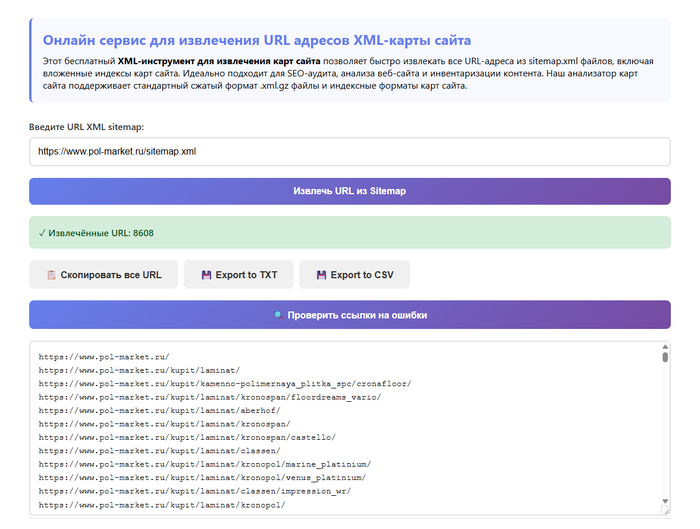 Тогда я решил сделать свой сервис, но что бы он в отличии от конкурентов был рабочим. Так на свет появился https://free-xml-sitemap-url-extractor.online/
