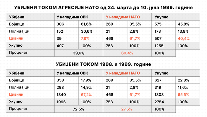 .(по данным проф. др. Обрад Стеванович. РТ Балкан) таблица (Убитые в течении агрессии НАТО с 24.03. по 10.06. 1999.г.) (Убитые в течении 1998.г. и 1999.г.)