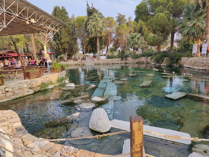 Прекрасный бассейн Клеопатры. Горячая вода, тело моментально покрывается пузырьками. Нам очень повезло с гидом, поэтому мы оказались первыми, кто вошёл в бассейн в этот день.