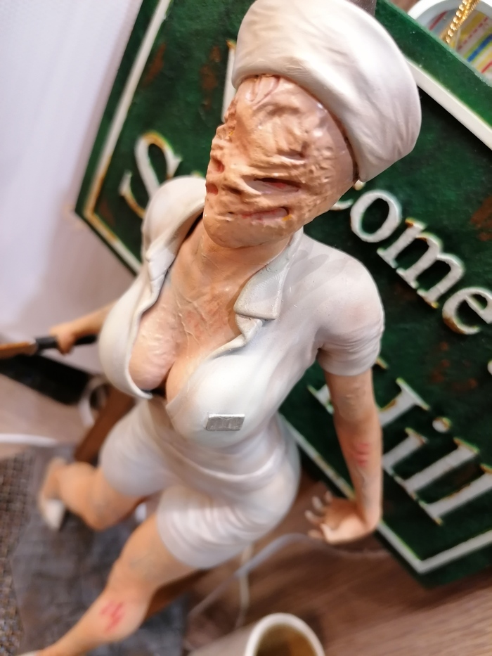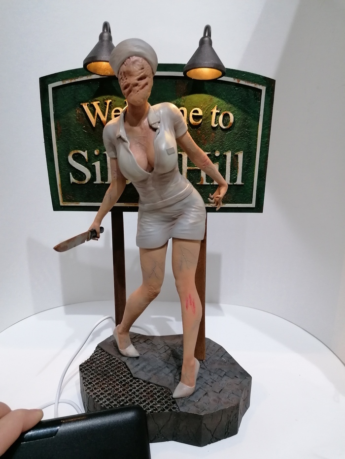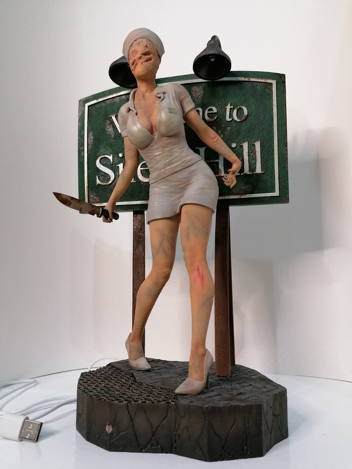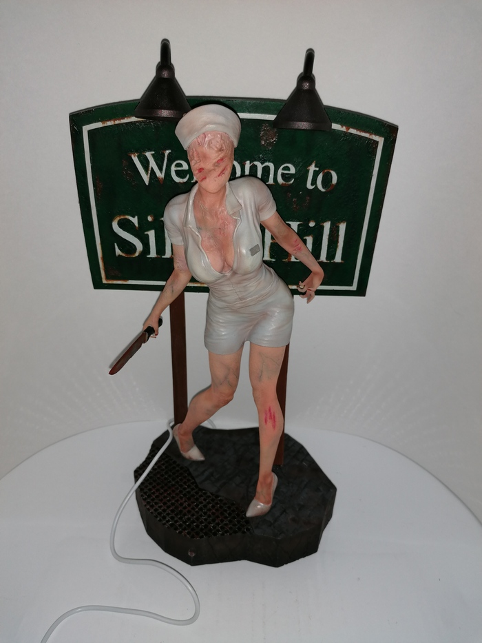 Характеристики: рост медсестры 28 см, всего 33 см. Фотополимерная смола, принтер anycubic photon m3 plus. Постобработка пилочкой, шкурочкой, акриловыми красочками tamiya. Ламповый домашний уют и угнетающая атмосфера тихого холма в одном комплекте.